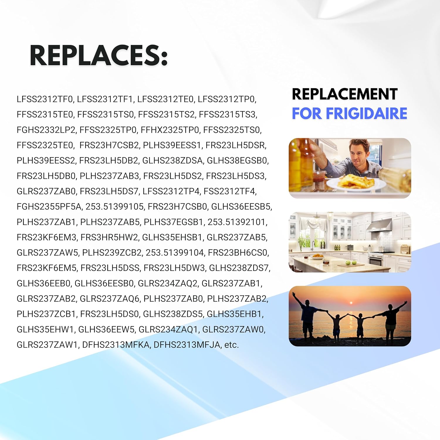 It is compatible with Frigidaire Series: LFSS2312TF0, LFSS2312TF1, LFSS2312TE0, LFSS2312TP0, FFSS2315TE0, FFSS2315TS0, FFSS2315TS2, FFSS2315TS3, FGHS2332LP2, FFSS2325TP0, FFHX2325TP0, FFSS2325TS0, FFSS2325TE0, DFHS2313MFKA, DFHS2313MFJA, FRS23LH5DS9, FRS23H7CSB2, PLHS39EESS1, FRS23LH5DSR, PLHS39EESS2, FRS23LH5DB2, GLHS238ZDSA, GLHS38EGSB0, FRS23LH5DB0, PLHS237ZAB3, FRS23LH5DS2, FRS23LH5DS3, GLRS237ZAB0, FRS23LH5DS7, LFSS2312TP4, FFSS2315TS2, FSS2312TF4, FGHS2355PF5A, FRS23H7CSB0, GLHS36EESB5, PLHS237ZAB1, PLHS237ZAB5, PLHS37EGSB1, 253.51392101, FRS23KF6EM3, FRS3HR5HW2, GLHS35EHSB1, GLRS237ZAB5, GLRS237ZAW5, PLHS239ZCB2, 253.51399104, FRS23BH6CS0, FRS23KF6EM5, FRS23LH5DSS, FRS23LH5DW3, GLHS238ZDS7, GLHS36EEB0, GLHS36EESB0, GLRS234ZAQ2, GLRS237ZAB1, GLRS237ZAB2, GLRS237ZAQ6, PLHS237ZAB0, PLHS237ZAB2, PLHS237ZCB1, FRS23LH5DS0, GLHS238ZDS5, GLHS35EHB1, GLHS35EHW1, GLHS36EEW5, GLRS234ZAQ1, GLRS237ZAW0, GLRS237ZAW1, etc.
